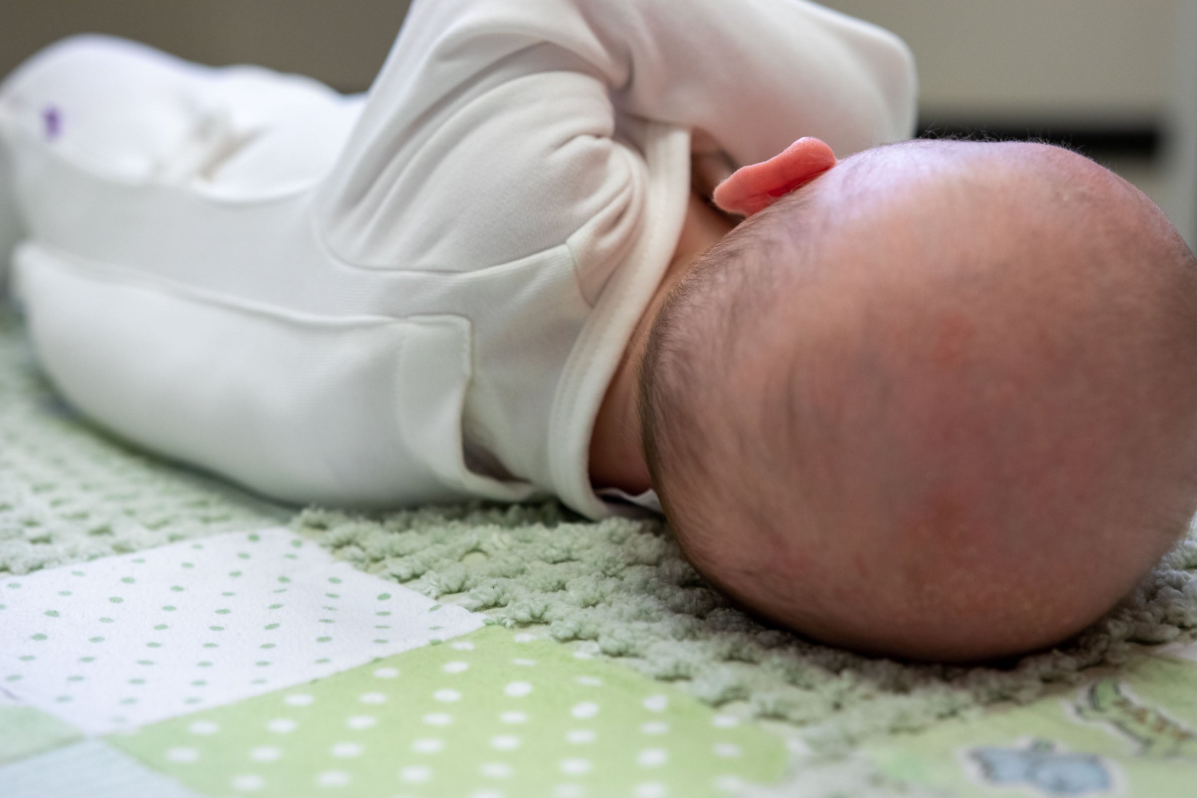 The most important thing to do is to relieve the pressure on the flat spot of the head. This is done primarily by repositioning the head during sleep (turn the head away from the flat spot). The hard part is getting the baby to keep the head in the new position; many babies will automatically reposition the head to the flat side as it is the comfortable position. The AAP discourages the use of sleep positioners and pillows as they are a suffocation risk. So what is a parent to do? The MoWo solves this dilemma. Since the positioner is attached to the infant’s back, it is impossible to suffocate on it. It keeps the infant positioned to allow the head to naturally and comfortably rotate to the correct side.